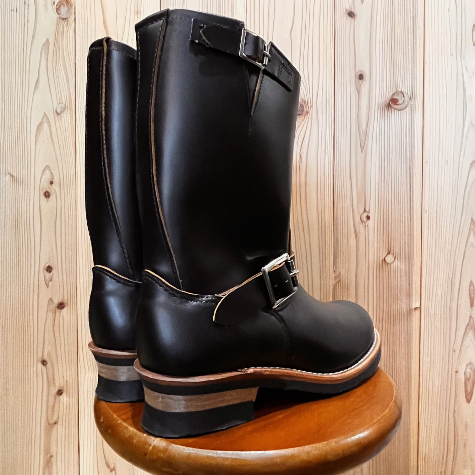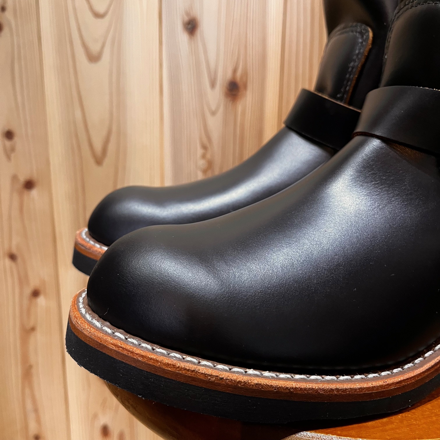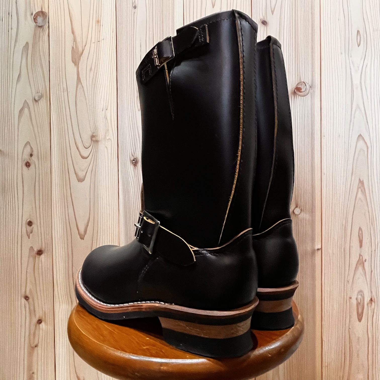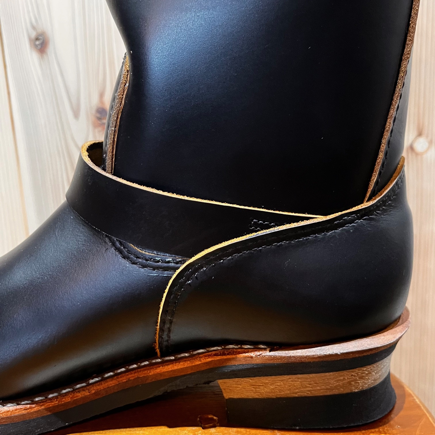 茶芯レザーの「ブラック・クロンダイク」に足首部分が絞られた「ストーブパイプ」仕様。
